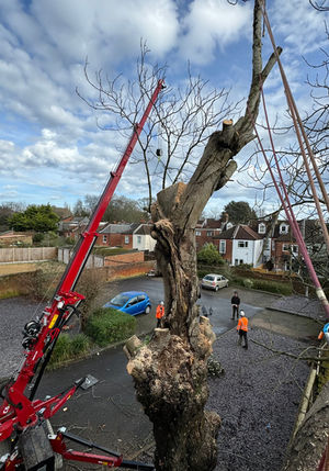 We decided to bring in a mini compact crane, which allowed us to lift and lower sections of the tree directly into the client’s property. This method ensured that all material was carefully handled without impacting the surrounding properties. Despite its small size, the crane was incredibly powerful, making the job efficient, precise, and safe.
